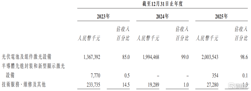 从收入来源来看,光伏电池及组件激光设备占比最高,2025年该部分收入占比高达98.6%,半导体先进封装和新型显示激光设备占0.1%。