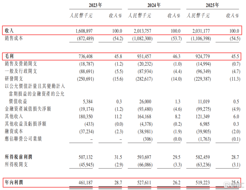 2023年、2024年及2025年(报告期),公司的营业收入分别为16.09亿元、20.14亿元、20.31亿元,毛利率分别为45.8%、46.3%和45.5%;公司净利润分别为4.61亿元、5.28亿元、5.19亿元,2025年净利润略有下滑。