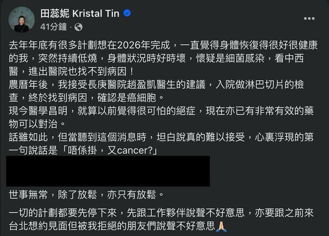 她在长文中透露她目前正在接受标靶药物治疗,全面停工专心休养。